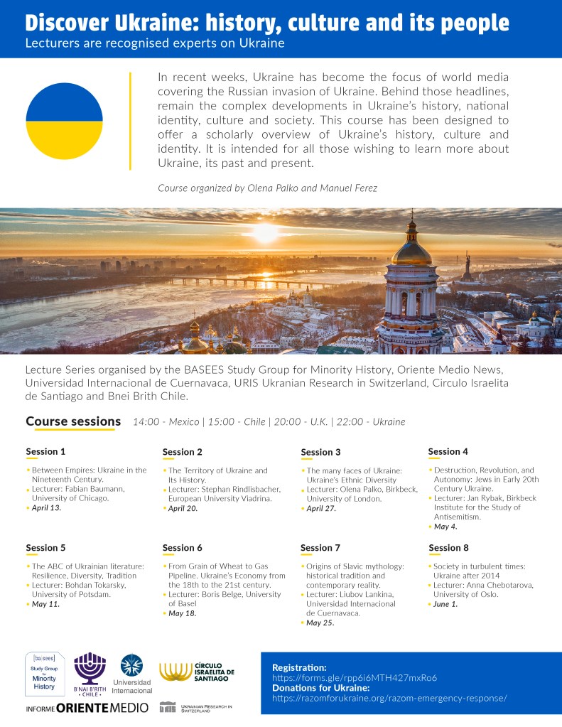 The first lecture in our virtual lecture series Discover Ukraine: History, Culture and its People, will take place on 13 April (15:00 Chile; 20:00 London; 21:00 Berlin; 22:00 Kyiv).